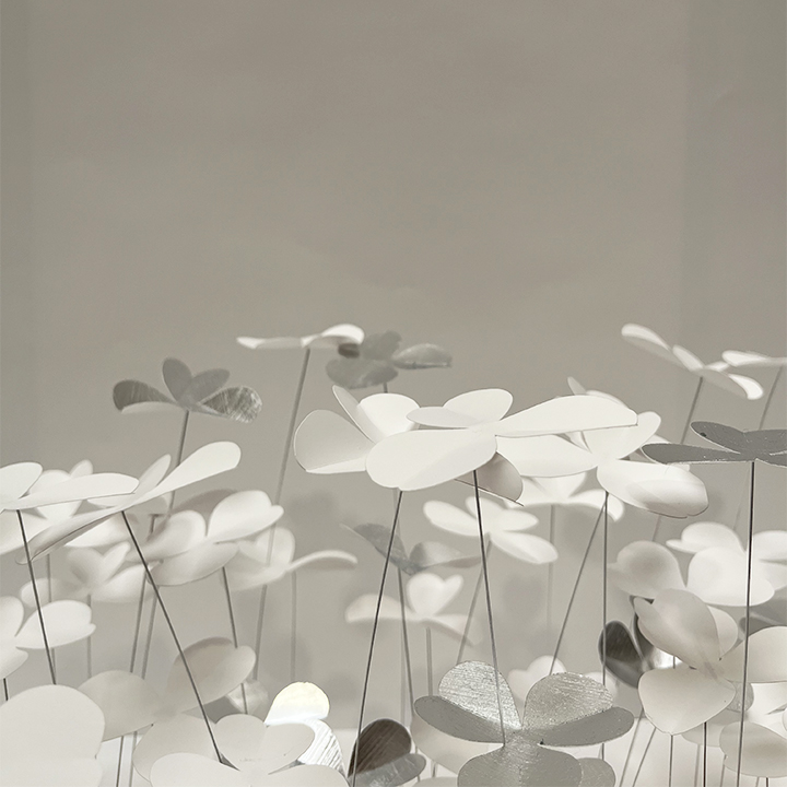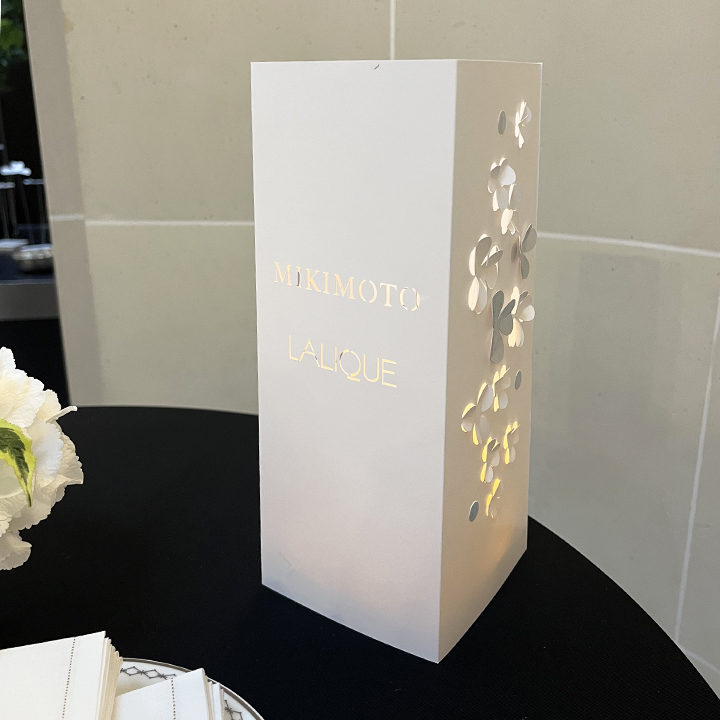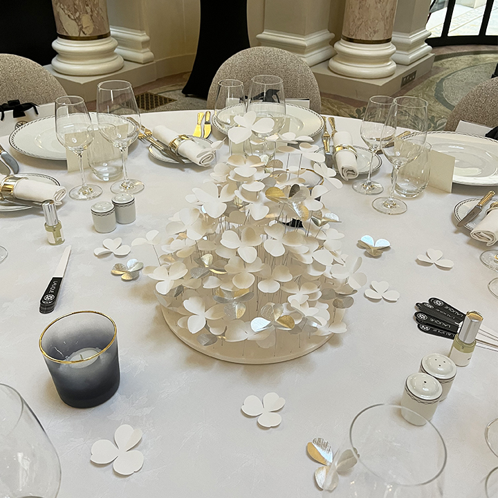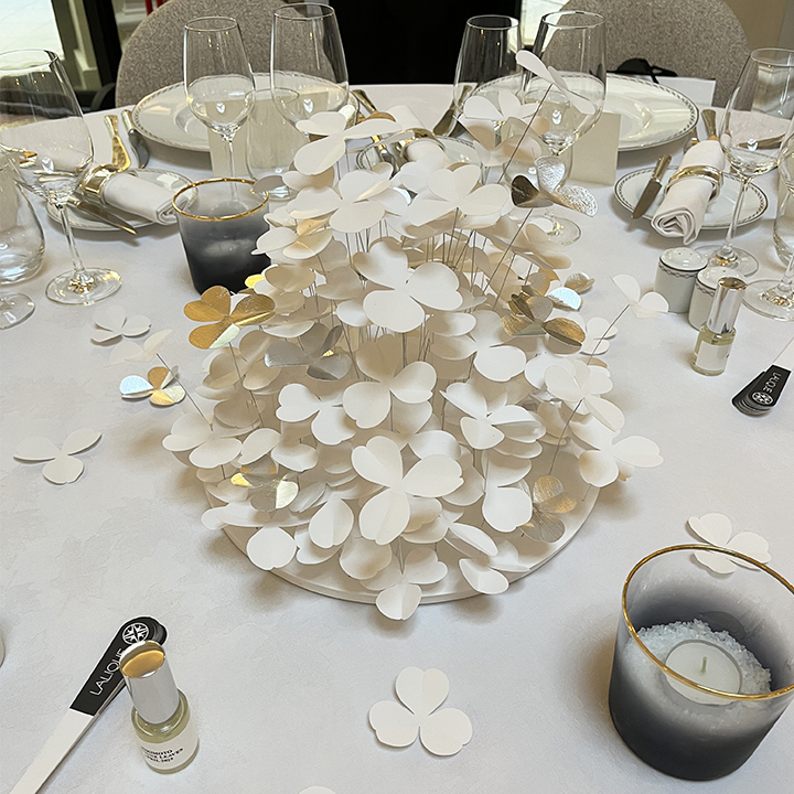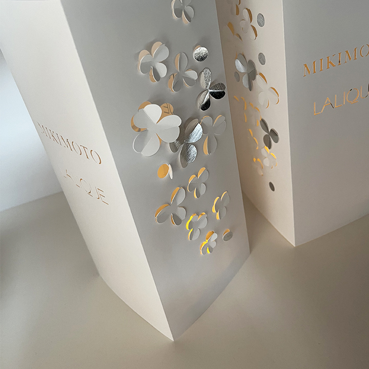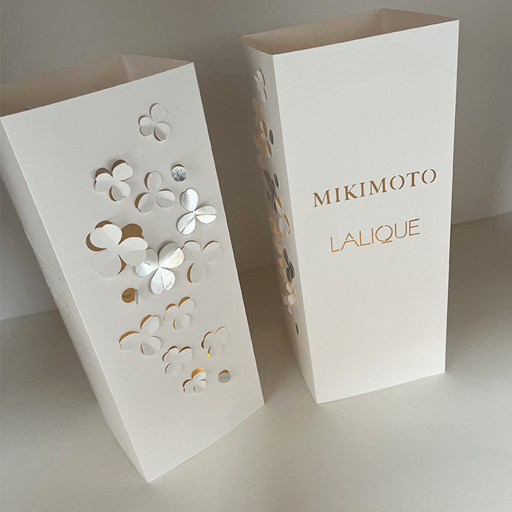 Création et réalisation de centres de tables « Trèfles » ainsi que des photophores en papier pour la décoration du lancement du nouveau parfum Lalique x Mikimoto