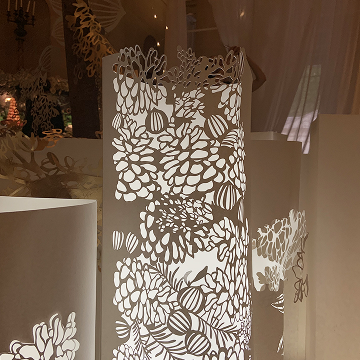 Création et réalisation de la décoration en papier du lancement presse de la maison Pierre Hermé. Noël 2019. Chapelle Expiatoire. Paris. Photophores, arbre, décor intérieur et extérieur.