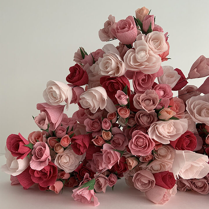 Création et réalisation de fleurs sur tiges en papier crépon pour la réalisation des vitrines de la Saint Valentin d’une maison de luxe.
